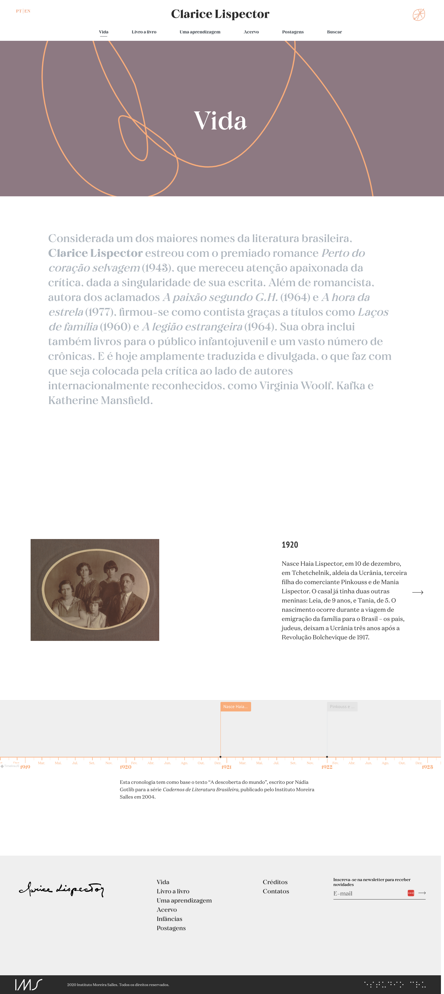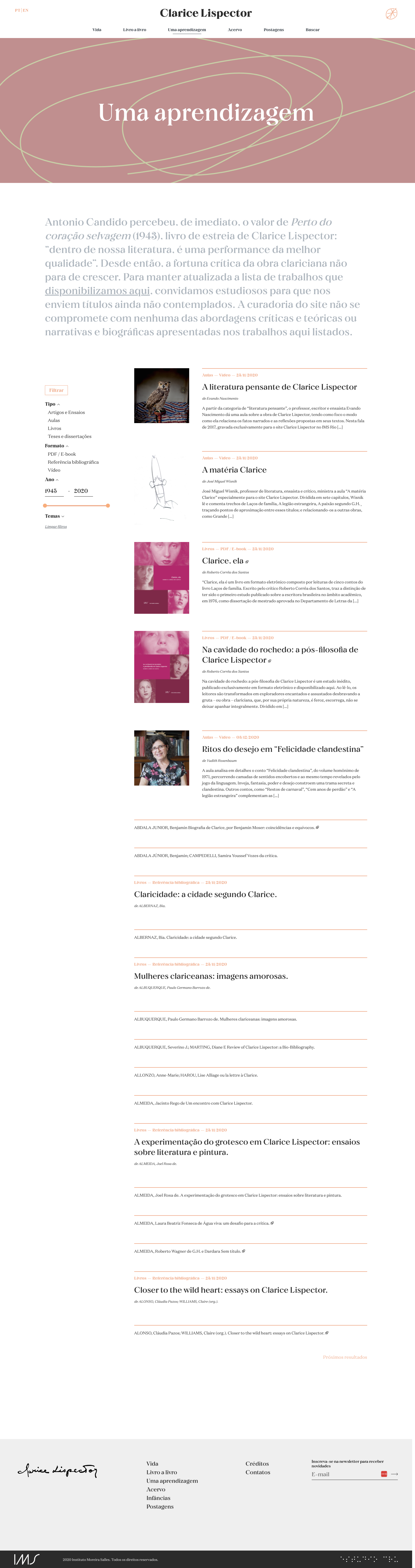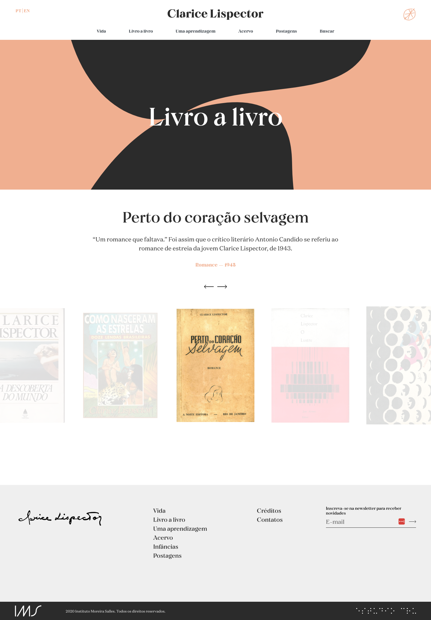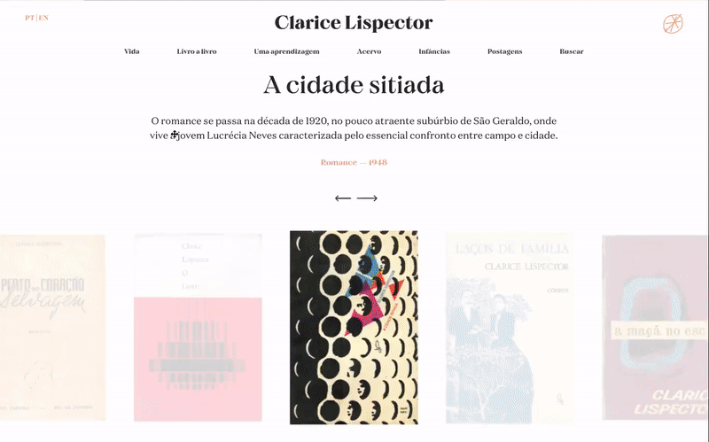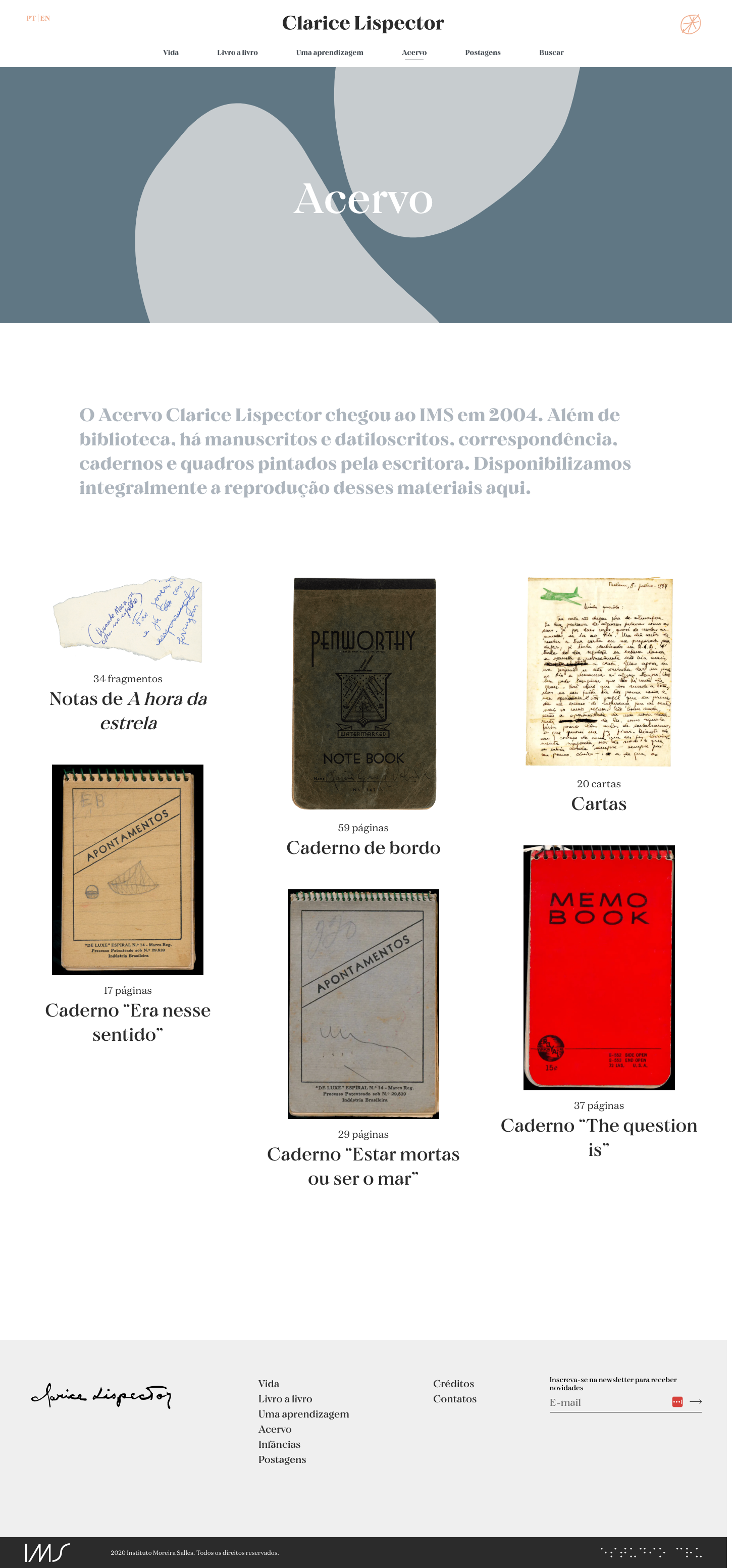 All items were cataloged and organized according to their purpose, bringing together facts from her life in a timeline, all books in a gallery with detailed information about each one, a section with originals, letters and manuscripts, a collection of productions academic articles referring to the author and her work, as well as posts from the institute’s team about Clarice’s life and work
